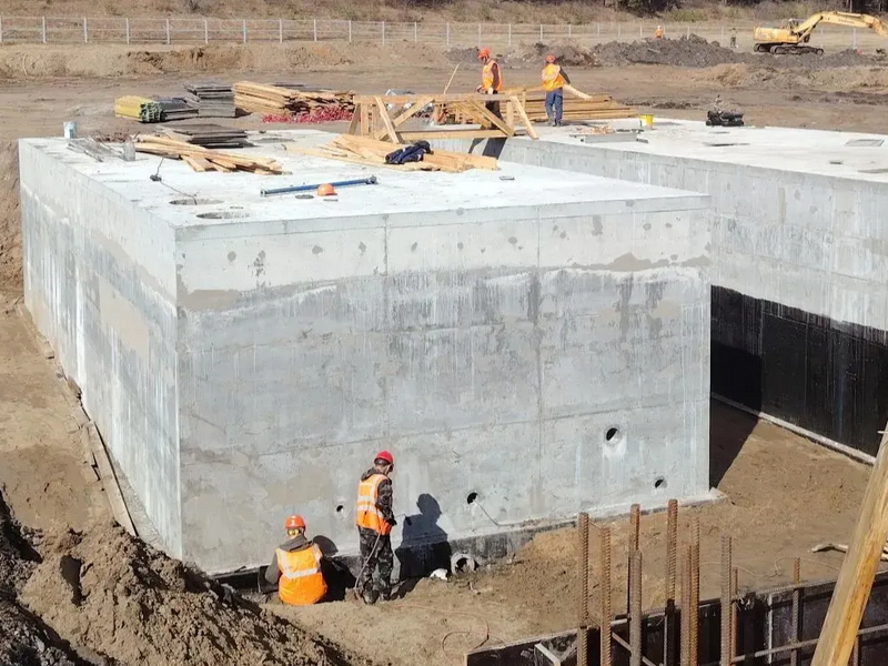 На площадке водозабора уже установили два резервуара для хозяйственно-питьевых нужд, возвели цокольный этаж здания водозаборного узла, там будет находиться насосное оборудование. Сейчас рабочие армируют перекрытие станции второго подъёма, где впоследствии смонтируют систему фильтрации, а также копают котлован под ливневые ёмкости. Планируемый срок окончания работ – конец 2026 года.