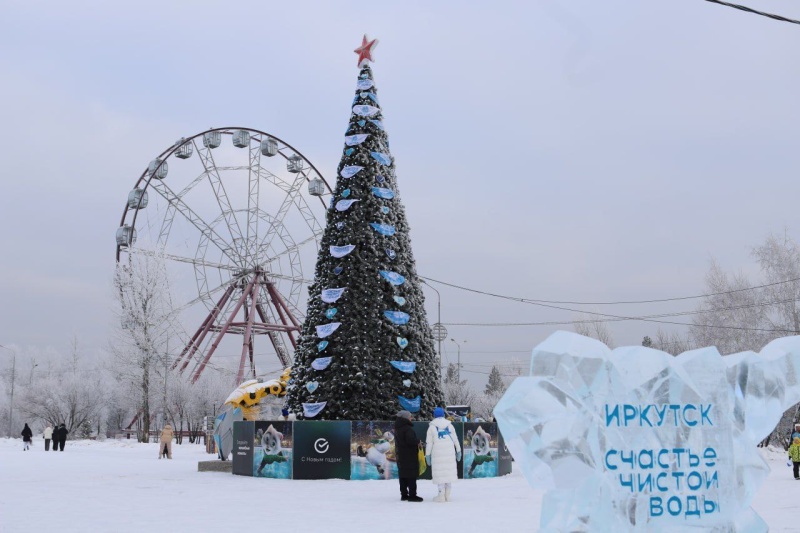 «Мы украсили ель в стиле проекта «Счастье чистой воды». Игрушки в палитре белого, серебристого и синего цветов изготовили мастера «Дома ремесел» музея истории города Иркутска имени А. М. Сибирякова и студенты Иркутского колледжа экономики, сервиса и туризма. Среди них рыбы-омули, нерпы, байкальские звезды, шары, на которых изображены байкальские и ангарские пейзажи, игрушки-сердца», – рассказала советник мэра Инга Корочкина.