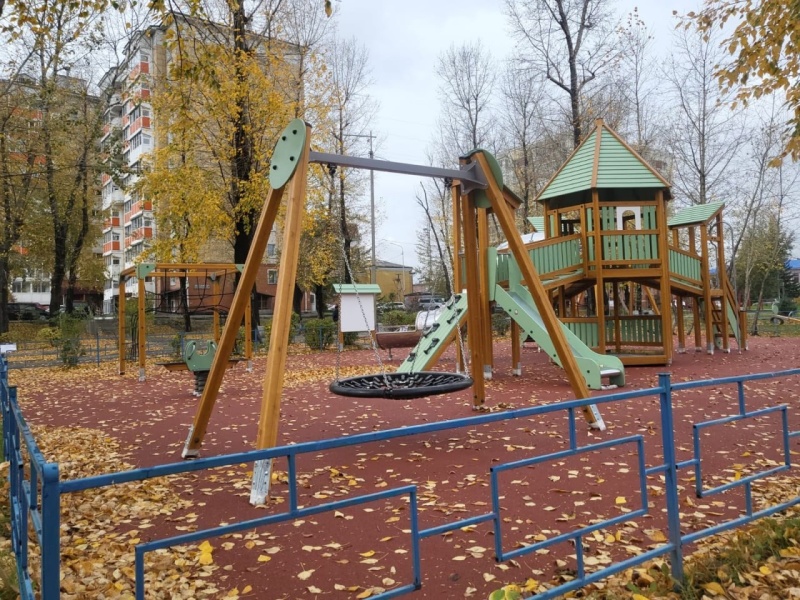 На территории смонтировали резинопол, установили игровой и спортивный комплексы, песочницу, качели, в том числе «Гнездо».