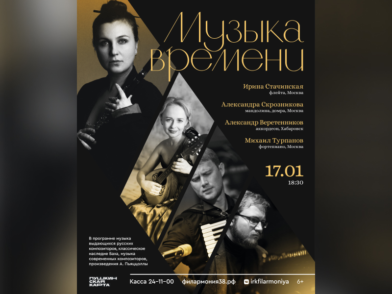 17 января в концертном зале Иркутской областной филармонии состоится концерт лауреатов международных конкурсов – Ирины Стачинской (флейта), Александры Скрозниковой (мандолина, домра), Александра Веретенникова (аккордеон) и Михаила Турпанова (фортепиано) – «Музыка времени» (6+). Об этом сообщает «ИркСиб» в понедельник, 15 января, со ссылкой на пресс-службу филармонии.