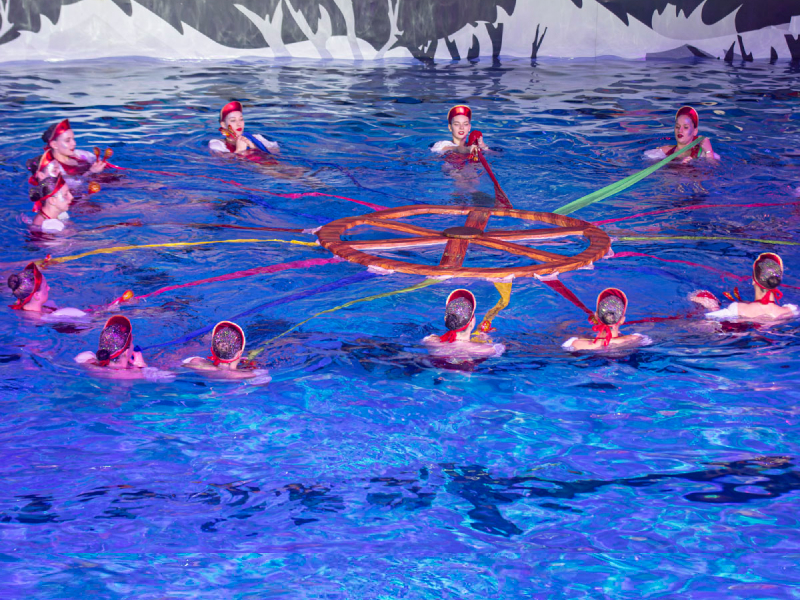 Действие постановки разворачивалось в трех пространствах – на сцене, на воде и в воздухе. В главных ролях выступили именитые спортсмены: олимпийские чемпионки Влада Чигирева и Елена Прокофьева, чемпионки мира Варвара Субботина и Анна Удовик.
